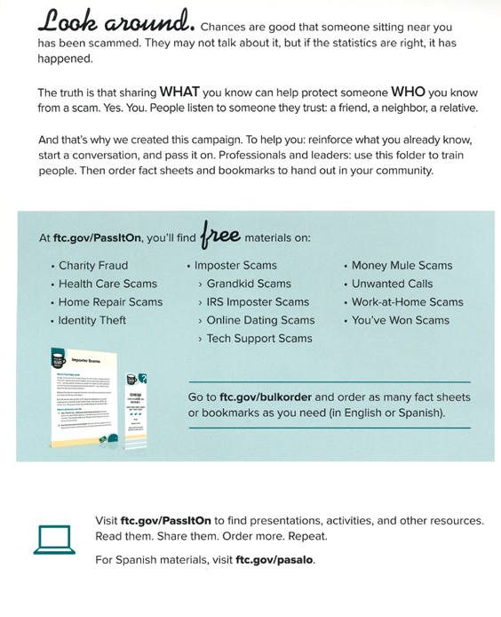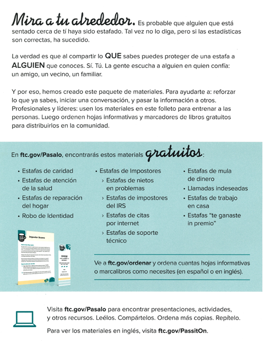 The Federal Trade Commission has created a series of fact sheets to help you avoid a few of the most commons scams. We’ve linked to both the English and Spanish versions below.